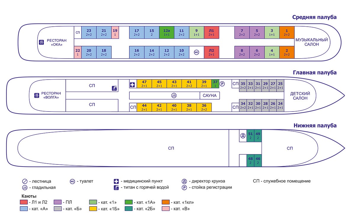 К категории А относятся каюты: 10–12, 14–18, 20, 21, 23. Двухместная каюта (площадь от 10,5 до 11,5 m²) со всеми удобствами, расположенная на средней палубе. В каюте: два раскладных дивана (шириной 140 см), кондиционер, холодильник, душ, туалет, раковина. Возможно размещение 3-го и 4-го человека на дополнительном месте – раскладной диван
