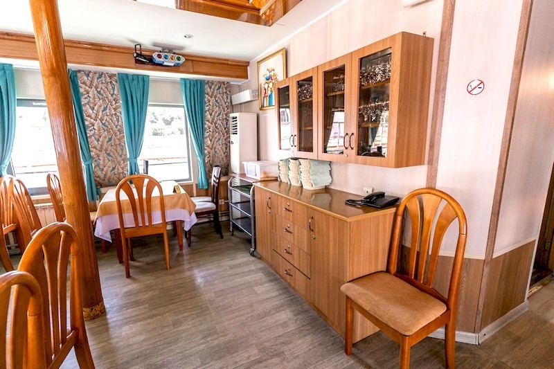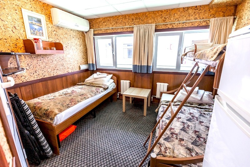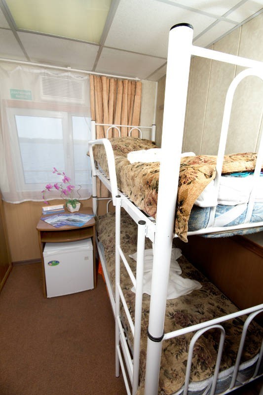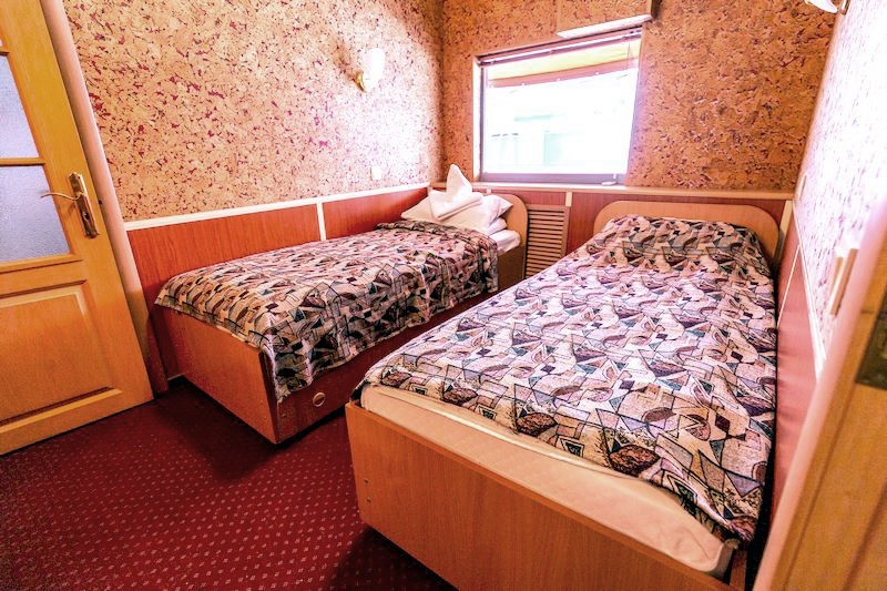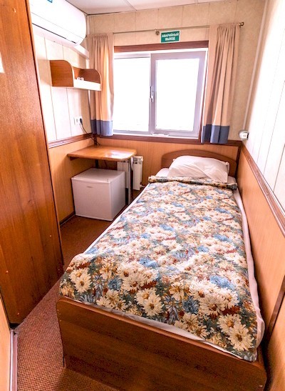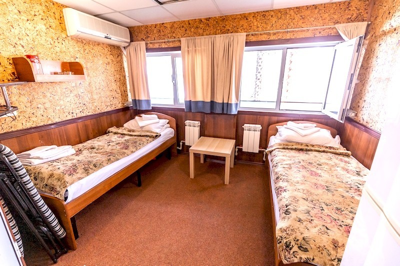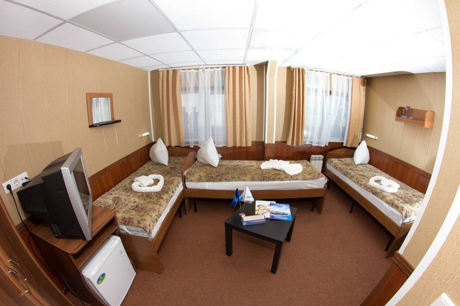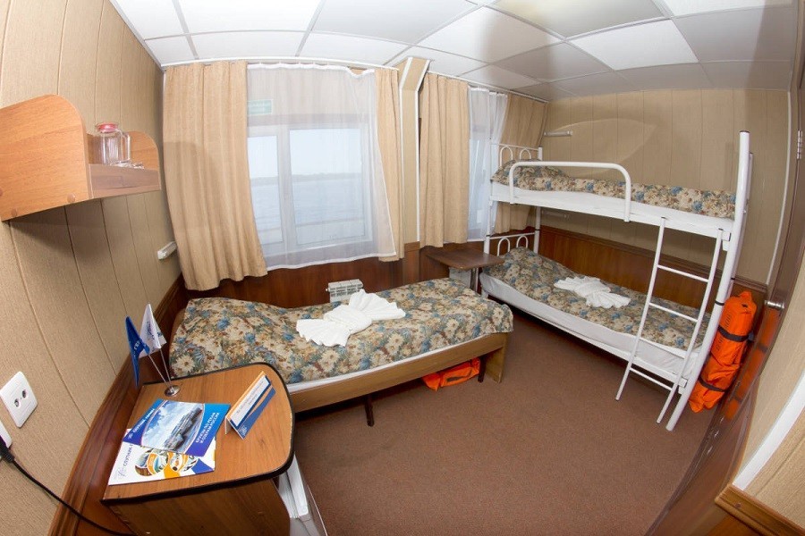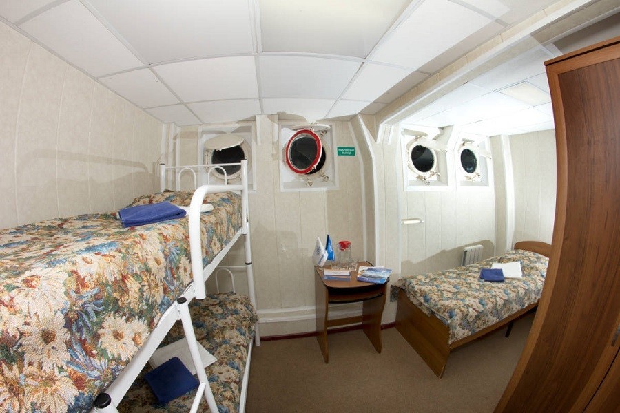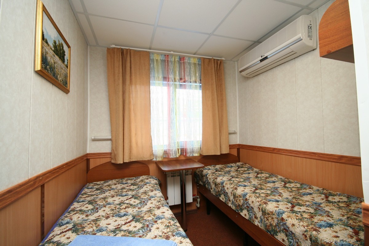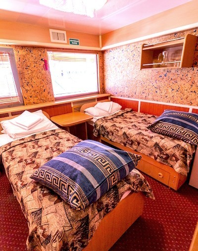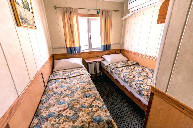 Теплоход предлагает каюты для размещения от 1 до 4 человек, большинство из которых оснащены санузлом, душем и кондиционером.