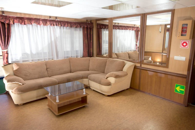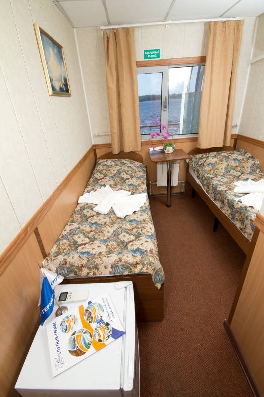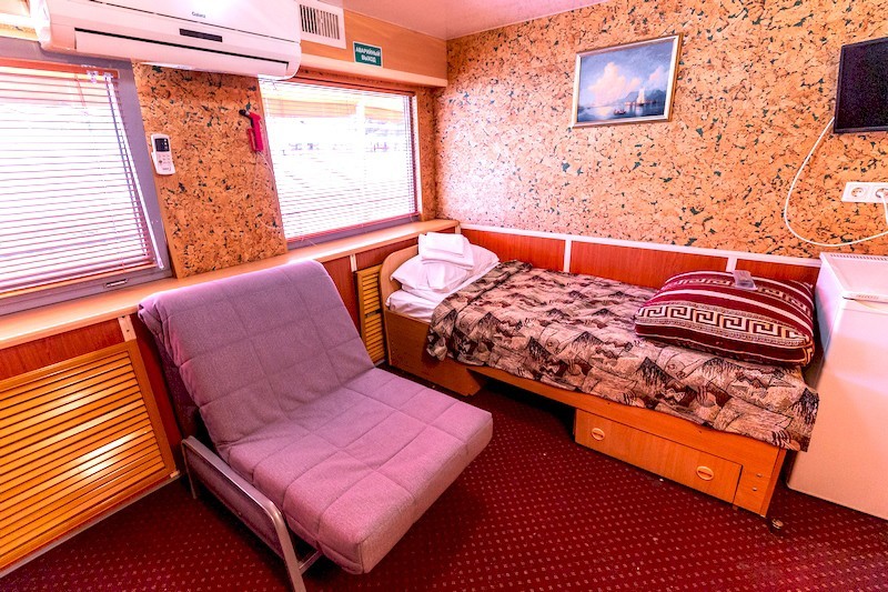Отправляясь в путешествие на теплоходе, можно выбрать каюту с удобствами любой категории: от эконома до двухкомнатного Люкса. Каюты на средней и шлюпочной палубах оснащены холодильниками. Во всех каютах, кроме кают расположенных на нижней палубе, предусмотрено кондиционирование.