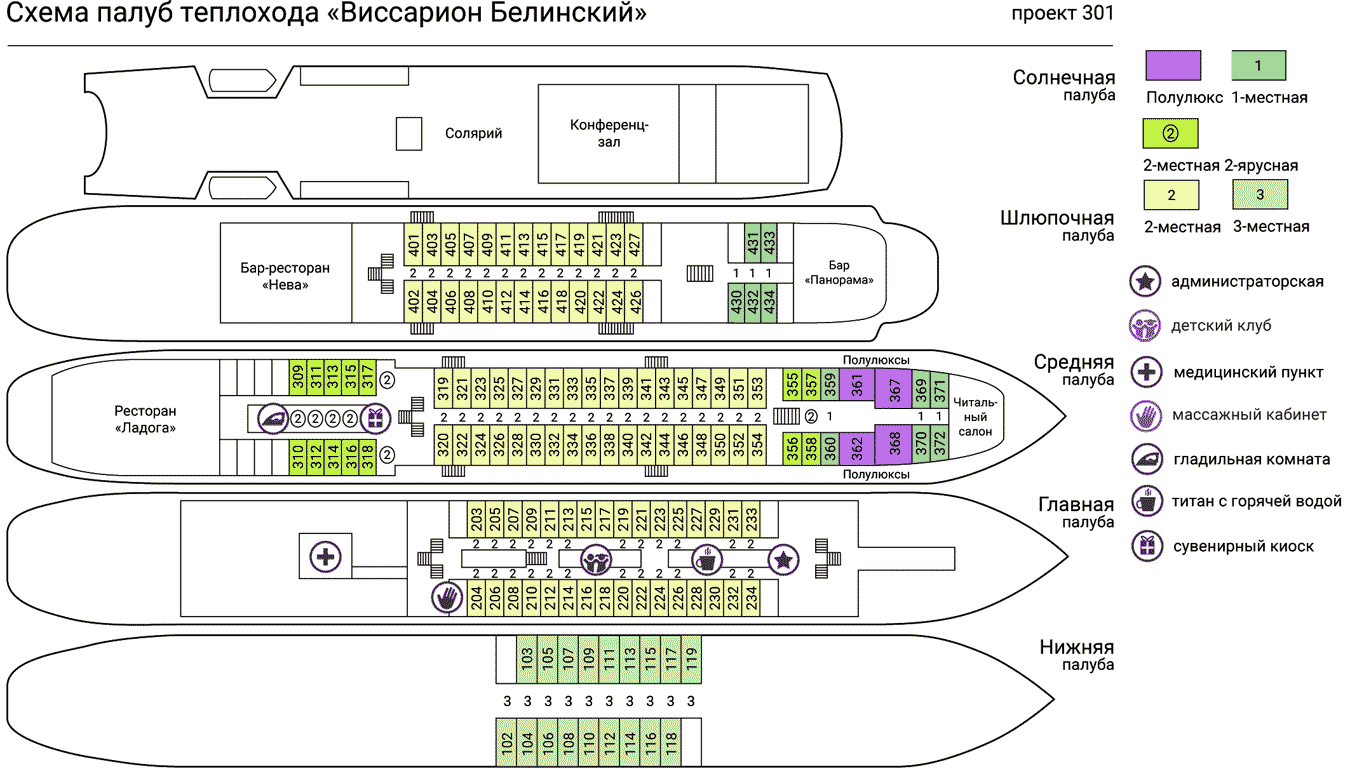 Нашим костям доступно 135 кают: 4 класса «Полулюкс», 11 одноместных, 92 двухместных одноярусных, 14 двухместных двухъярусных и 18 трехместных одноярусных. Для каждой каюты предусмотрен тариф со скидками.